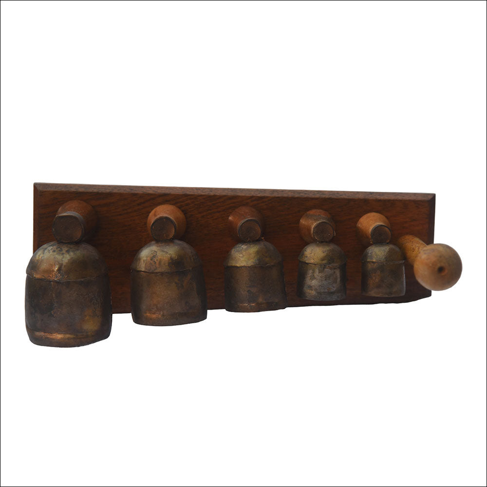 A set of 5 handmade bells that is mounted on a stand it is a beautiful and meaningful object that can bring a unique and special element to any space or spiritual practice.