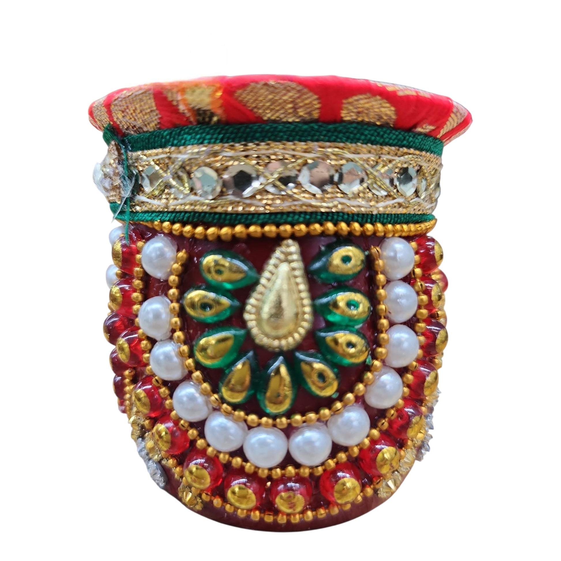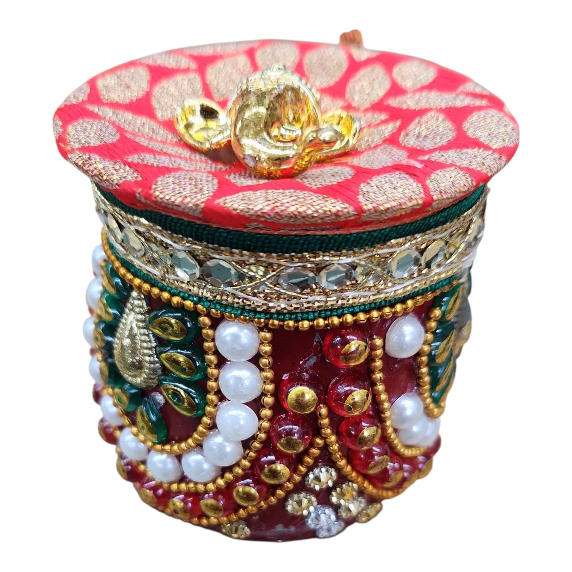 A decorated Tabudi—also known as Lun Tabudi or wedding bells—is a traditional ceremonial vessel used in Hindu and Gujarati wedding rituals. Typically made of metal like steel and adorned with beads, zari, and vibrant fabrics, it holds symbolic items such as coins, grains, or salt. These items are believed to ward off the evil eye and bring good fortune and protection, especially for the groom during the wedding ceremonies.