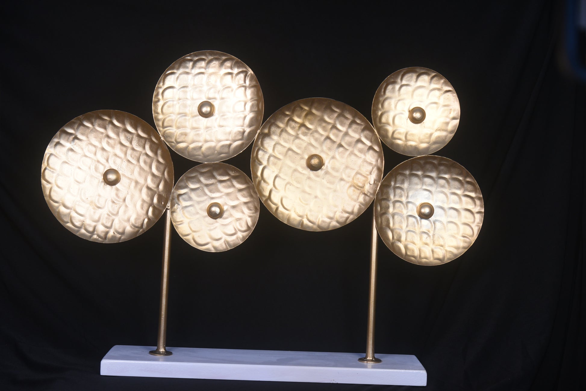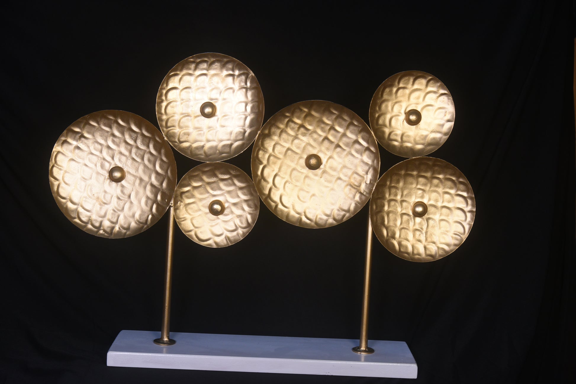 Experience the fusion of modern design and timeless elegance with our gold discs table decor. Its sleek, minimalist design effortlessly complements any decor style, from classic to contemporary. Whether displayed on a coffee table, console, or dining table, these gilded accents exude sophistication and refinement, making a bold statement in any room.