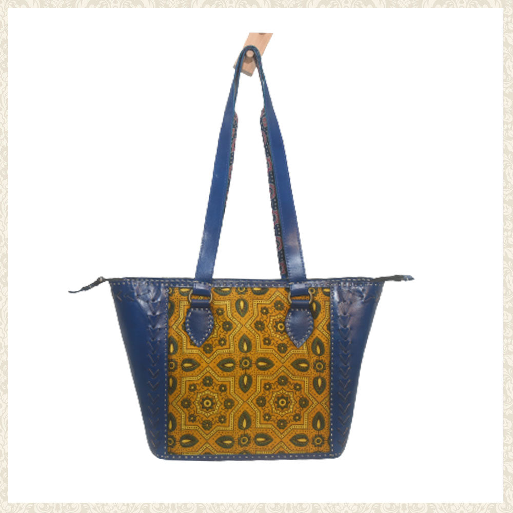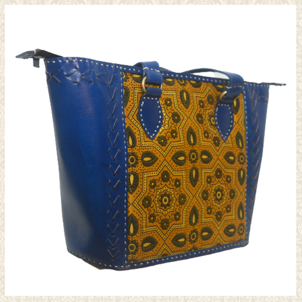 Handcrafted Leather and Mashru Silk Bag with Zipper Blue