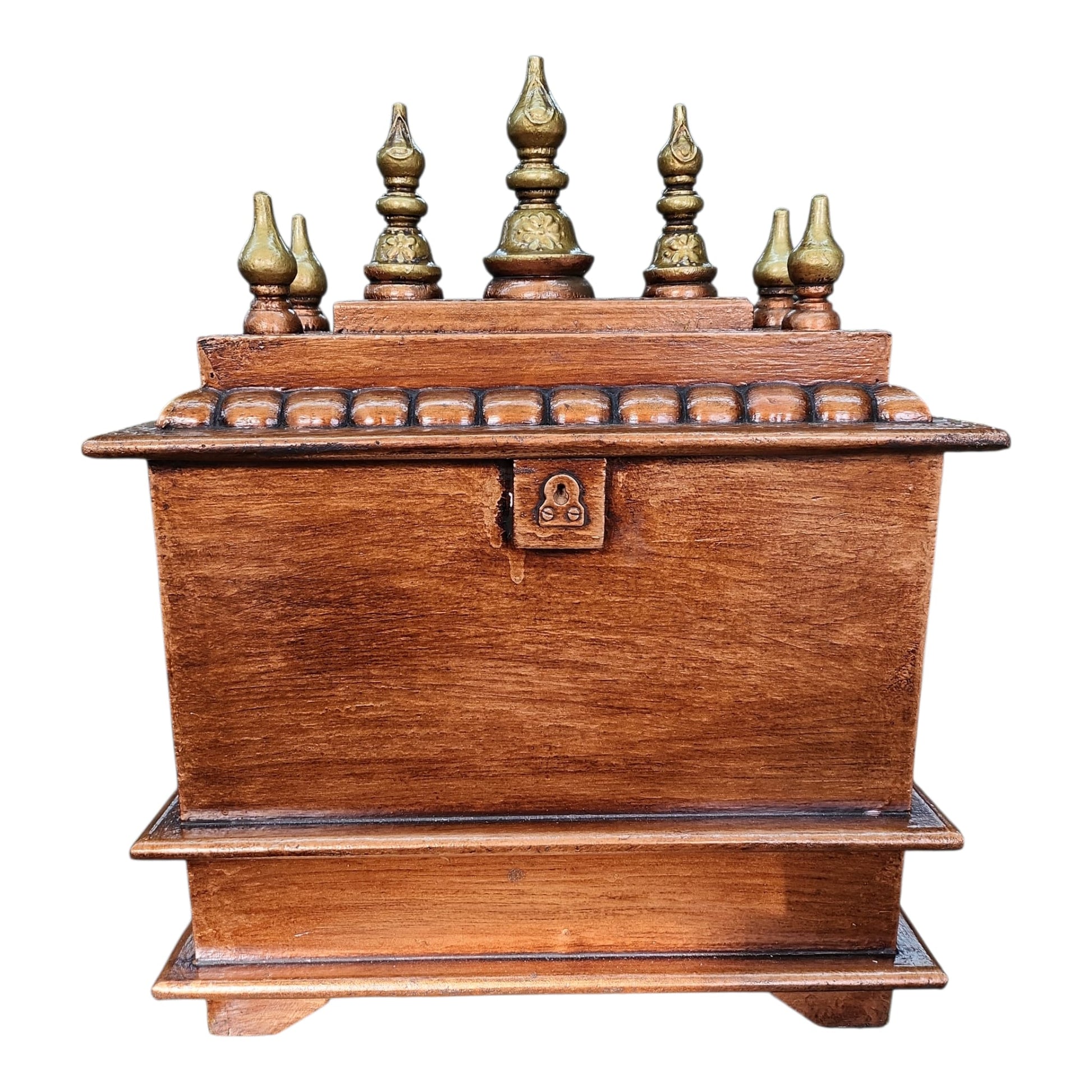 Crafted from Mango Wood, this Temple features a stunning combination of brown, gold simbolising devotion, purity, and prosperity. The intricate detailing which is a beautiful addition to your home or office, creating a serene environment for prayers and rituals.