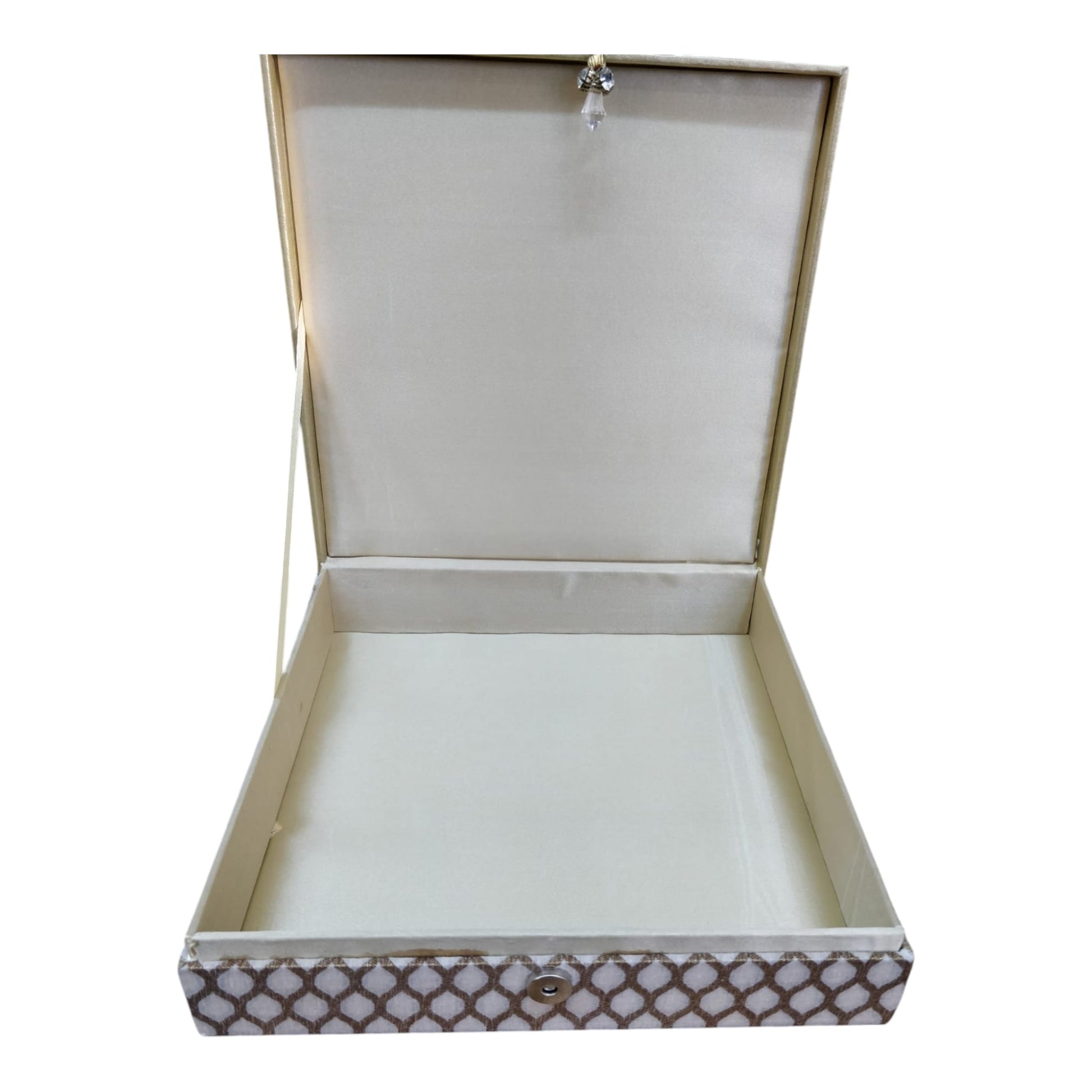 With multiple compartments, it provides ample space for rings, earrings, bangles, necklaces, and other valuables, ensuring they remain organiSed and protected. The gold and cream finish enhances its regal appeal, making it a timeless addition to your collection.