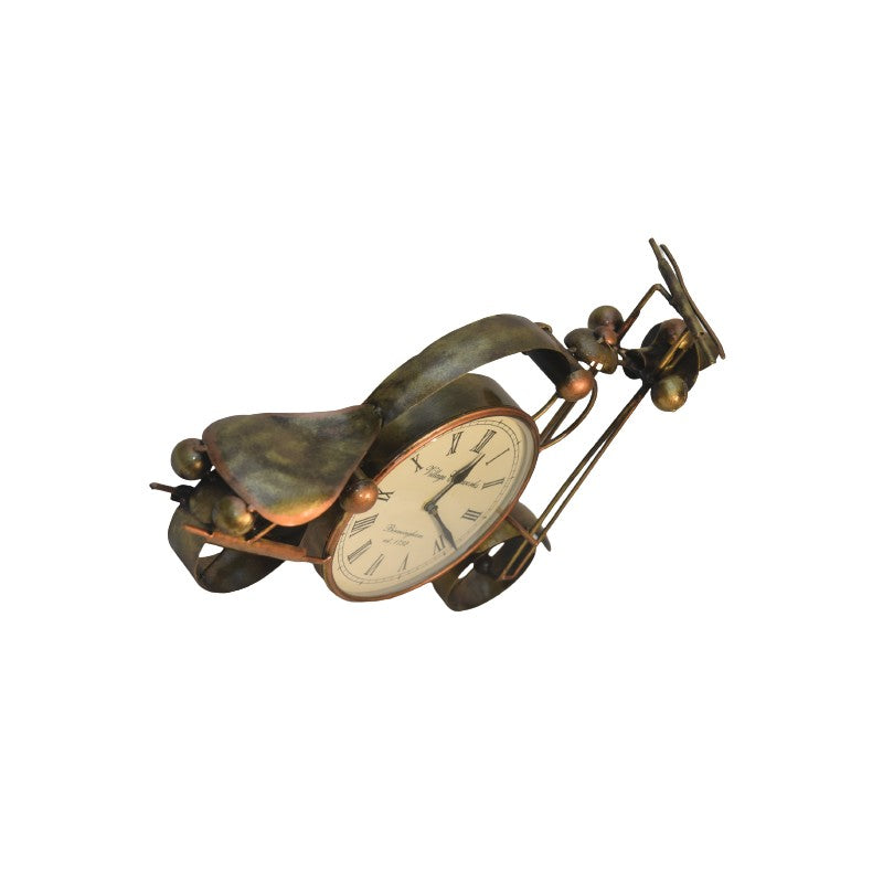 Expertly crafted by artisans, this bike-themed clock features a sturdy frame and a vintage-inspired finish, evoking the charm of old-world craftsmanship. The integrated clock is set within the front wheel, blending seamlessly into the design while offering an easy-to-read time display. Perfect for lovers of retro aesthetics and unique décor, this piece is both decorative and practical.